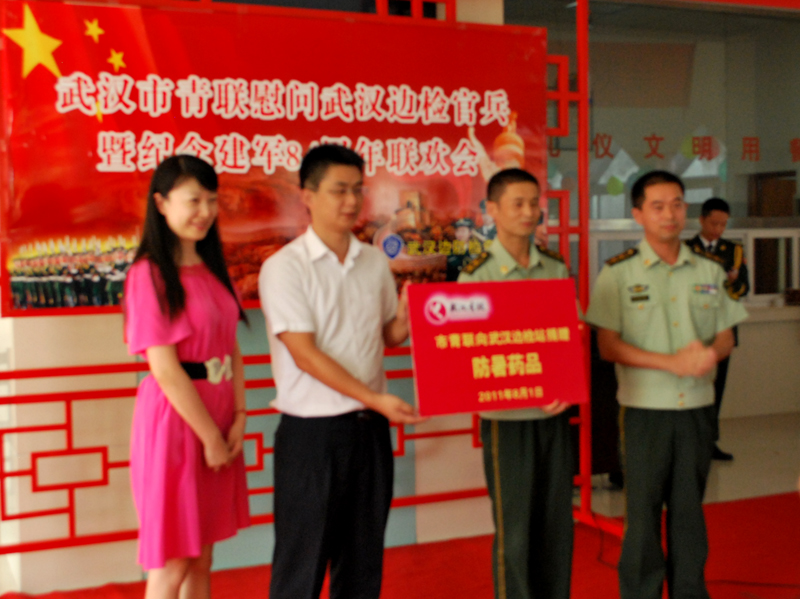 2011年8月1日,團(tuán)市委書(shū)記、武漢市青年聯(lián)合會(huì)主席沈濤及武漢市青年聯(lián)合會(huì)副秘書(shū)長(zhǎng)、東信醫(yī)藥集團(tuán)董事長(zhǎng)田南希代表武漢市青年聯(lián)合會(huì)向武漢邊檢官兵捐贈(zèng)防暑飲品。在紀(jì)念人民解放軍建軍84周年之際,表達(dá)了武漢市青年聯(lián)合會(huì)對(duì)邊檢官兵的崇敬之情,及東信醫(yī)藥集團(tuán)對(duì)邊檢官兵工作的關(guān)心與支持。