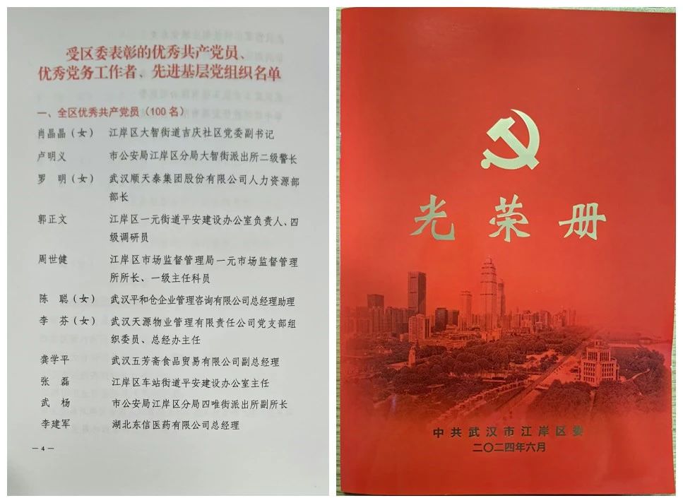 6月28日,武漢市江岸區(qū)召開2024年“兩優(yōu)一先”表彰大會,湖北東信醫(yī)藥有限公司總經理李建軍同志被中共武漢市江岸區(qū)委評為“全區(qū)優(yōu)秀共產黨員”。這一榮譽不僅是對李建軍同志個人品德和卓越貢獻的肯定,也是對東信醫(yī)藥黨支部黨建工作的高度認可。
