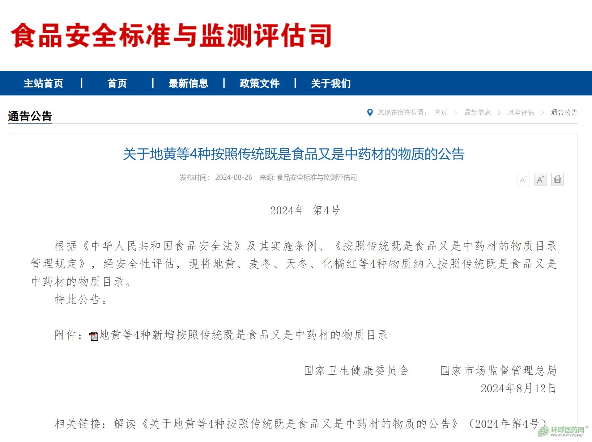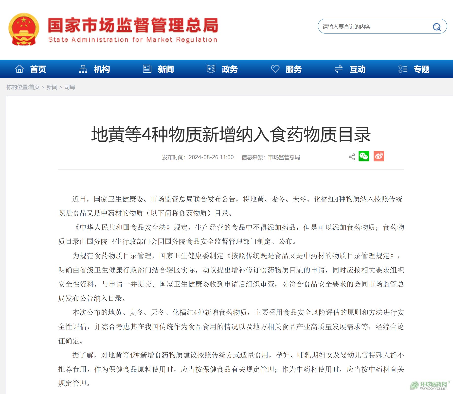 8月26,國家衛(wèi)生健康委、市場監(jiān)管總局聯(lián)合發(fā)布公告,將地黃、麥冬、天冬、化橘紅4種物質納入按照傳統(tǒng)既是食品又是中藥材的物質目錄。據(jù)了解,對地黃等4種新增食藥物質建議按照傳統(tǒng)方式適量食用,孕婦、哺乳期婦女及嬰幼兒等特殊人群不推薦食用。作為保健食品原料使用時,應當按保健食品有關規(guī)定管理;作為中藥材使用時,應當按中藥材有關規(guī)定管理。