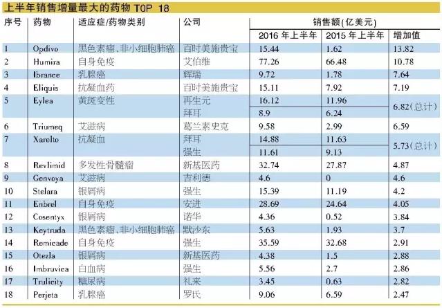 最近,各制藥公司的二季報(bào)陸續(xù)出爐,F(xiàn)irstWord網(wǎng)站通過(guò)比較各種藥物與去年上半年相比的銷售額增加值,列出了今年上半年銷售增量最大的18種藥物。